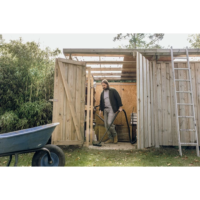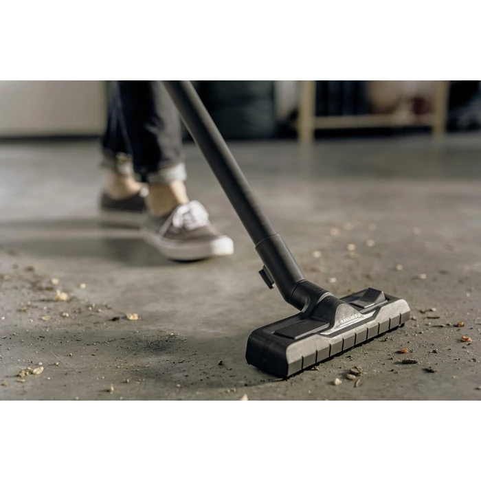 A KWD 5 S V-25/5/22 nedves és száraz porszívó fekete készülékkel kiváló szívóerőt biztosít, miközben energiatakarékos marad: A porszívó mindössze 1100 wattos energiafogyasztásával optimális tisztítási eredményeket ér el száraz, nedves, finom vagy durva szennyeződések esetén. A készülékhez robusztus, 25 literes rozsdamentes acéltartály, 5 méteres kábel, 2,2 méter hosszú szívótömlő, kapcsolható padlófúvóka, lapos pliszírozott szűrő és gyapjú szűrőzsák tartozik. A lapos pliszírozott szűrő különösen alkalmas non-stop nedves és száraz porszívózásra, a szűrő cseréje nélkül. A szabadalmaztatott szűrőeltávolítási technológiának köszönhetően a lapos pliszírozott szűrő másodpercek alatt eltávolítható, miközben elkerülhető a szennyeződéssel való érintkezés. Ha a szűrő elszennyeződött, a beépített szűrőtisztító funkcióval gyorsan és hatékonyan tisztítható. Az elektrosztatikus védelemmel ellátott levehető fogantyú lehetőséget biztosít különböző fúvókák közvetlen csatlakoztatására a szívótömlőhöz. Ez különösen előnyös a szűk helyiségekben történő porszívózásnál. A szívótömlő a helytakarékos tárolás érdekében biztonságosan felakasztható a készülékfejre. A lökhárítón lévő parkolóhely lehetővé teszi a csövek és a padlófúvóka gyors és kényelmes tárolását, ha rövid szünetet tart a munkában.