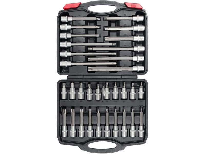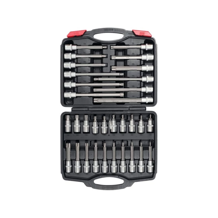 Egy 32 TORX csillagkulcs készlet, csavarok lazítására tervezve. Autó szervizben, építkezésen, gyártásban és mezőgazdasági gépekben használható. Anyag: S2 és CrV Satírozott króm felület Méretek: Hosszúság 55 mm: T20, T25, T27, T30, T40, T45, T50, T55, T60, T70 Hosszúság 100 mm: T20, T25, T27, T30, T40, T45, T50, T55, T60, T70 Hosszúság 140 mm: T40, T45, T50, T55, T60, T70. Hosszúság 200 mm: T40, T45, T50, T55, T60, T70 Szerszám nyél: 1/2' (12.7 mm) Praktikus hordozótáskában csomagolva Használati figyelmeztetések: Figyelem! Mindig használjon személyes védőfelszerelést a munka során.
