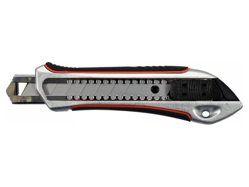18mm törhető pengéjű kés. A kés teste különleges cinkötvözetből készült, ami hosszú élettartamot és ellenállást biztosít a mechanikai sérülésekkel szemben. Az ergonomikus fogantyú minőségi ABS anyaggal és TPR csúszásgátló bevonattal van ellátva. Ez biztos fogást és nagy kényelmet biztosít. A fém vezetősín gondoskodik a sima és problémamentes működésről. Továbbá felszerelték 'auto lock' rendszerrel, ami védi a pengét a véletlen kilökődéstől vagy visszahúzódástól működés közben, akár 20N erővel szemben. Az 'auto lock' rendszernek köszönhetően a kés tökéletes vastag anyagok vágására vagy szűk részekben, ahol fennáll a veszélye, hogy a penge beragad. A kés pengéje SK5 acélból készült, amely nagyon jó vágási teljesítményt és hosszú élettartamot biztosít. Használati figyelmeztetések: Figyelem! Mindig használjon személyes védőfelszerelést munka közben.